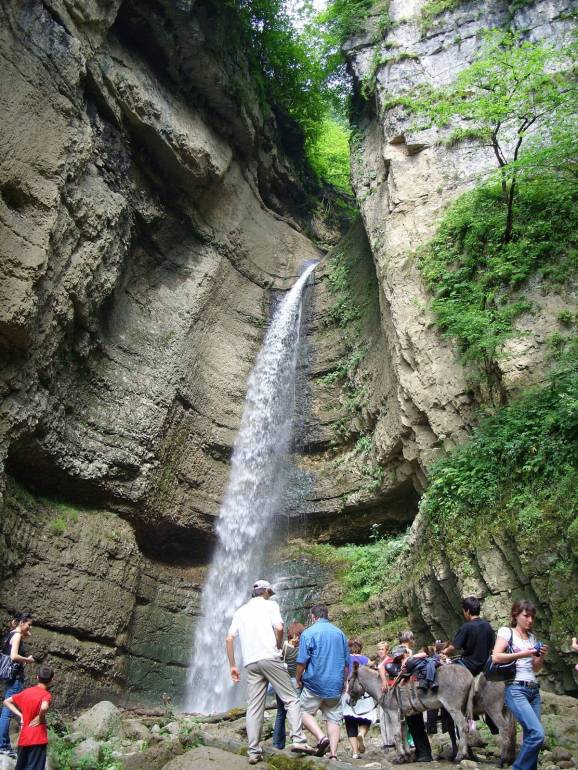 Мы вышли из автобуса и увидели эту неописуемую красоту скалы и водопады прямо над головой, а сбоку и внизу быстрая горная река с ледяной водой. Повсюду продавцы, продают местный кефир, национальные лепешки с овечьим сыром, местные сувениры, всяческую одежду. Имеются кафе с демократичными ценами!