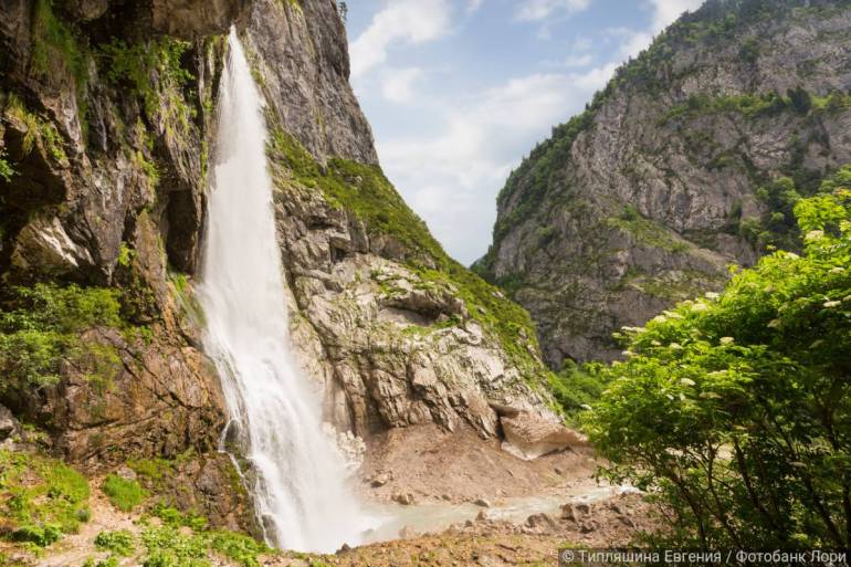 Водопад расположен в четырех километрах от дороги на озеро Рица;